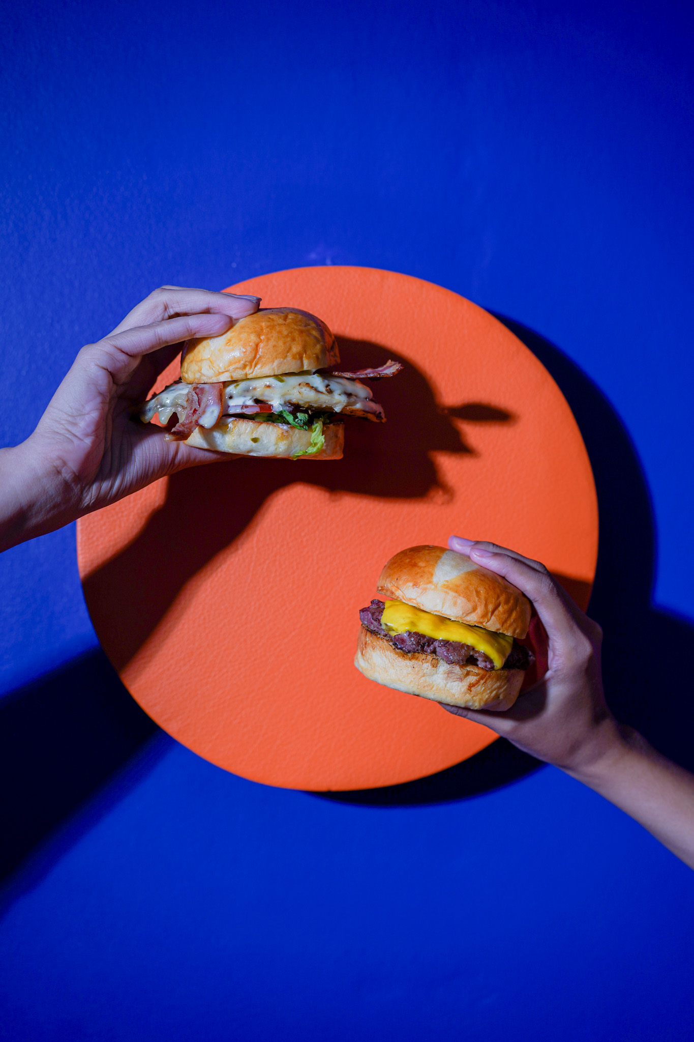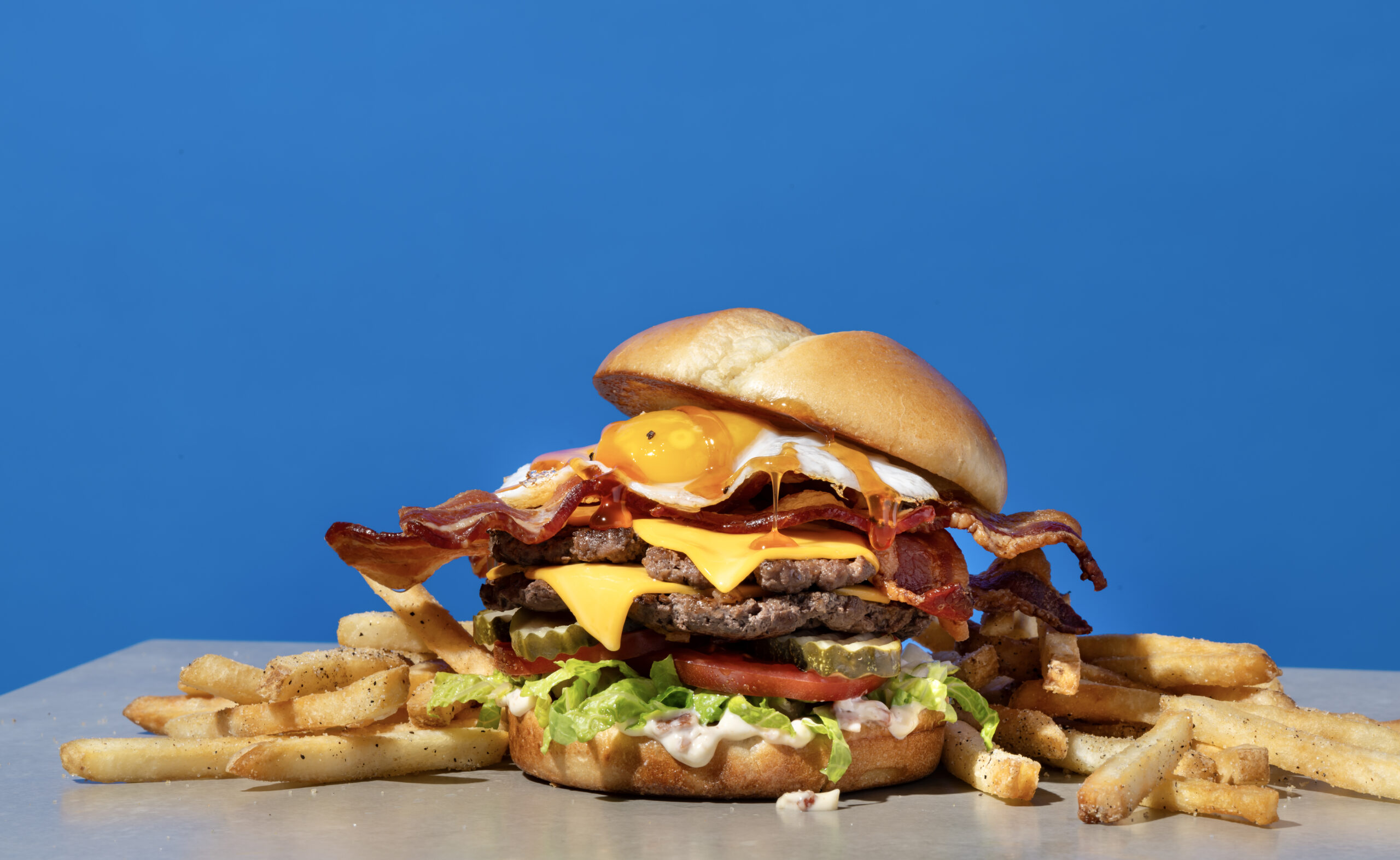 Stacked with two smashed beef patties, honey-cured bacon, melty American cheese, grilled onions, bacon aioli, crisp lettuce, fresh tomato, and pickles, then topped with a fried egg and a hot honey drizzle on a toasted potato bun. Breakfast, lunch, or dinner, this burger brings the flavor.