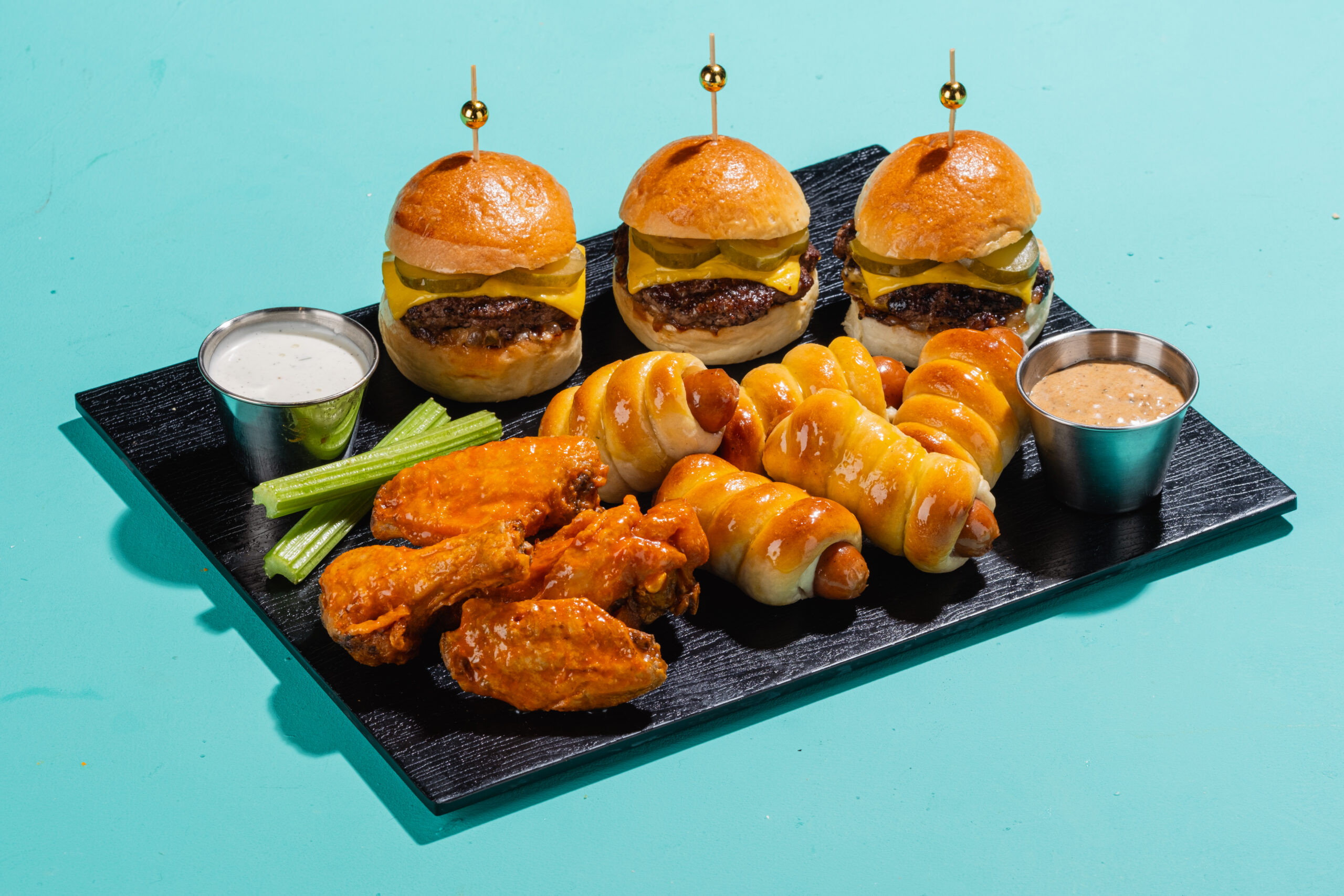 A shareable sampler board for 2 to 4 guests featuring pretzel dogs, smashed burger sliders, and bone-in wings served with your choice of ranch or bleu cheese dressing. Perfect for enjoying while watching the game