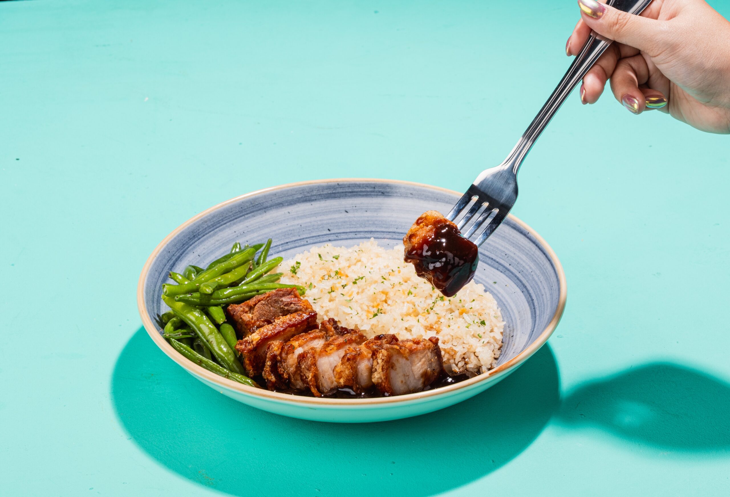 A local favorite featuring crispy, golden pork belly glazed with rich adobo sauce, served with sautéed green beans and fragrant garlic rice.